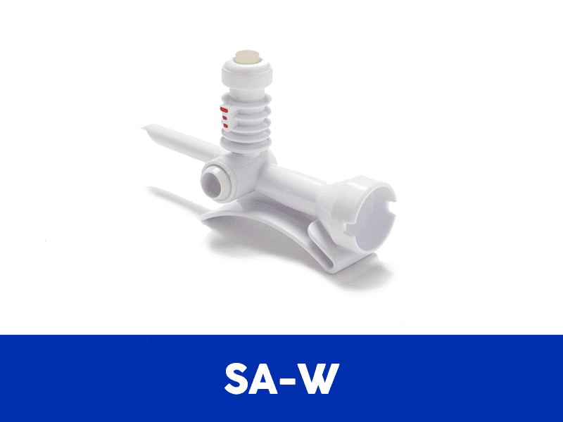 Otro Adaptador Espiga – W (Ref: SA-W) está diseñado para ser utilizado con la unidad de jeringa para extraer diluyentes, como solución salina normal o agua estéril, de una bolsa de suero.
