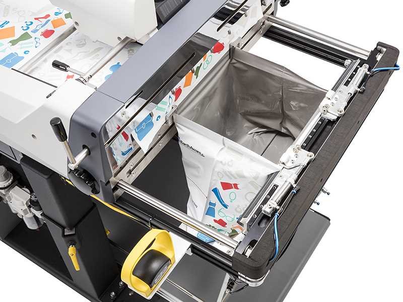 La impresión de la bolsa que está por salir se logra con una moderna impresora de transferencia térmica. Esto garantiza la precisión y la eficiencia en la ejecución de los pedidos que requieren recambios frecuentes de productos y etiquetas, e impide además que se formen colas de producto.