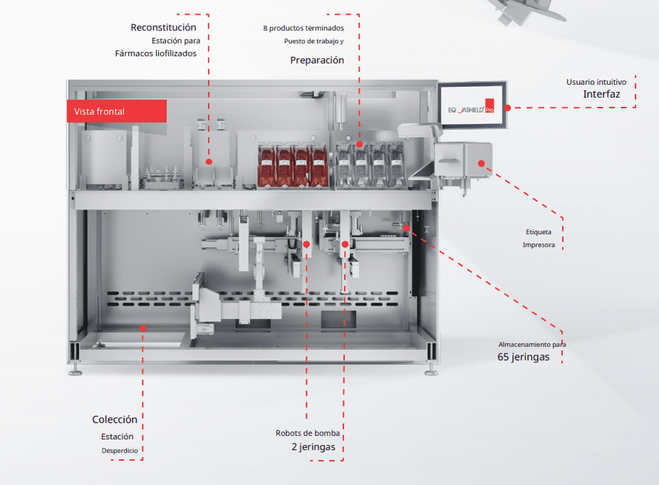A diferencia de la dependencia del robot tradicional de brazos robóticos que imitan el movimiento humano con el uso de aguja y jeringa que conduce a la posibilidad de goteos, derrames, aerosoles y liberación de vapores citotóxicos, Equashield pro utiliza estaciones múltiples enfoque compuesto para minimizar tanto el movimiento como el tiempo que lleva preparar una dosis como una línea de fabricación de fábrica. Equashield.