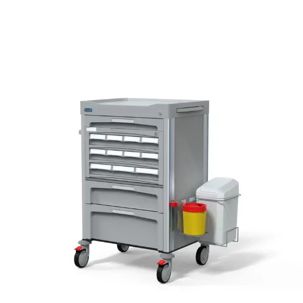 Los carros unidosis son un mobiliario hospitalario esencial para el transporte de medicamentos, fungibles o instrumentos en los centros sanitarios. Estos carros hospitalarios están adaptados a cassettes o maletas de medicación de distintos tamaños.